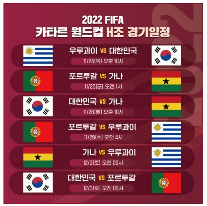 | 2022 카타르 월드컵 우루과이 vs 대한민국 경기중계 무료보는곳 (0) | 2022.11.18 |